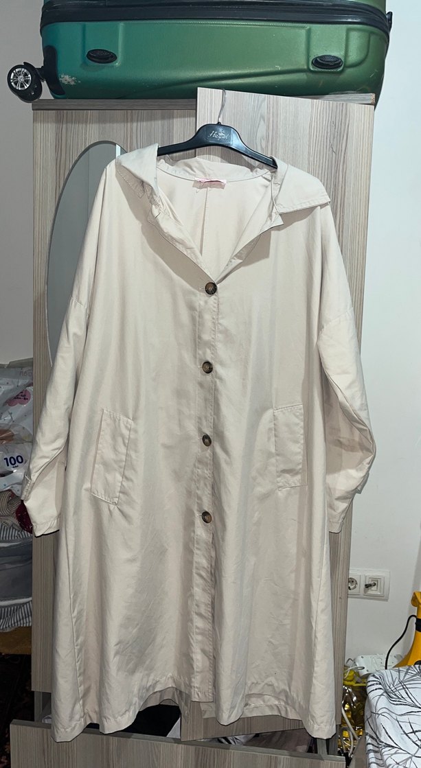 Düğmeli, uzun kollu, keten kumaştan yapılmış, bol kesim beyaz kadın kaban. Notlu yaka ve cep detaylarıyla günlük rahat sokak stili için uygundur.