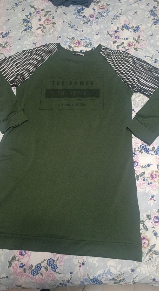 Koyu yeşil renkte, düğmeli, uzun kollu ve bol kesim kadın tunik. Baskılı kollara ve baskılı ön yüze sahip, günlük sokak stili için uygun.