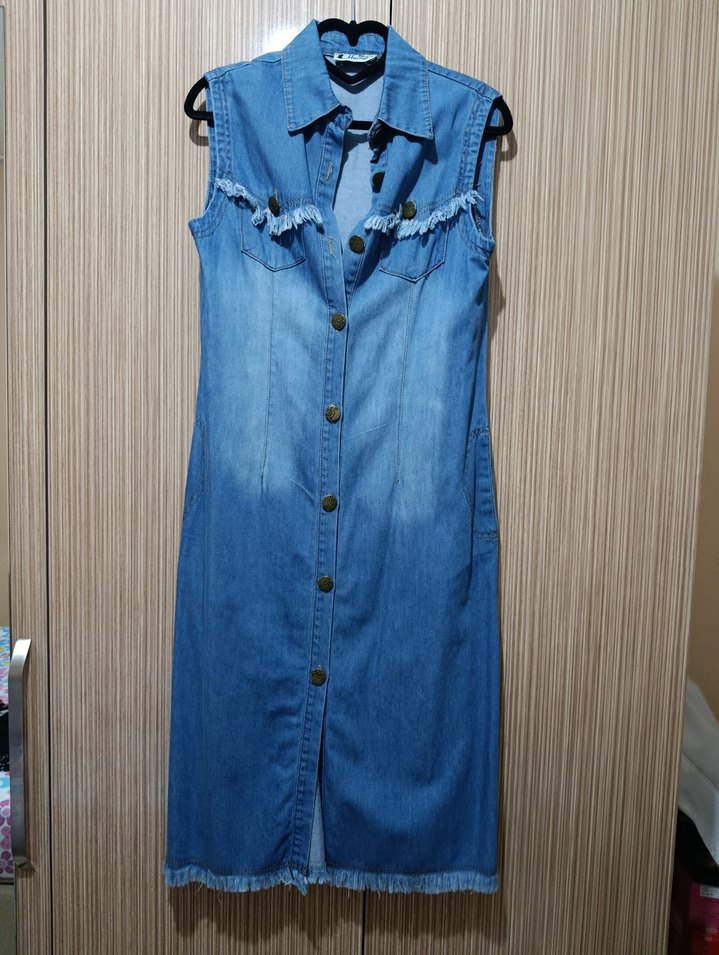 Düğmeli önü ve yakası kesik uzun kollasız kot ceket. Mavi ve gri tonlarda batik desenli, rahat kesim ve sokak stili. Günlük kullanıma uygun.