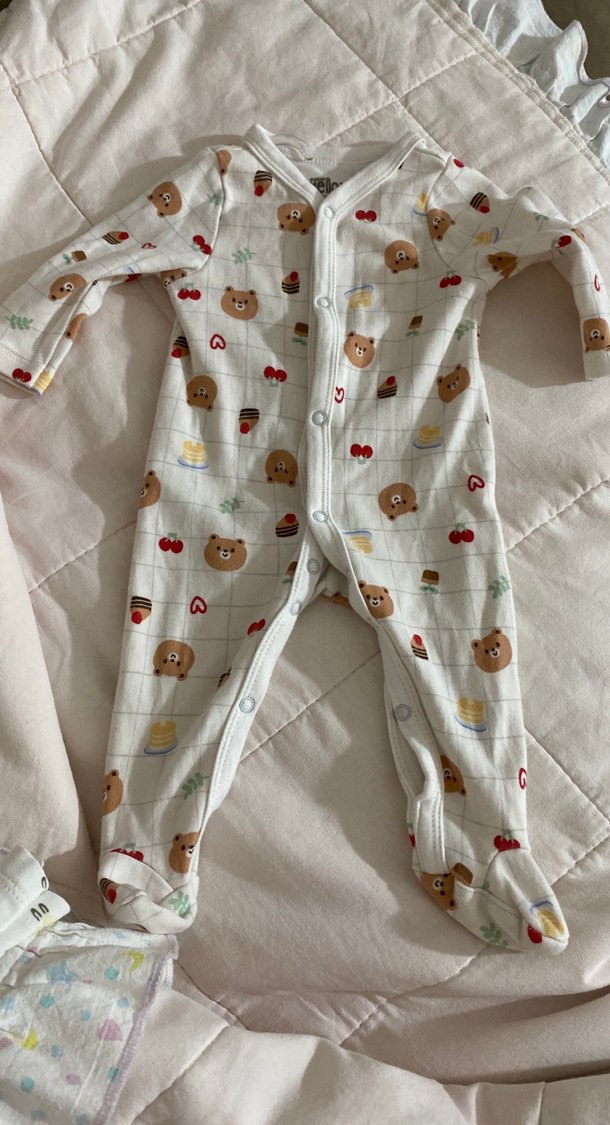 Pamuklu, uzun kollu ve düğmeli bebek tulumu. Pastel tonlarda, ayıcık ve meyve desenli.
