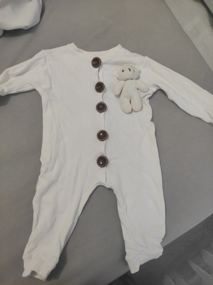 Uzun kollu, yuvarlak yaka beyaz bebek tulumu, düğmeli ön kısmı ve yumuşak, sıcak kumaşıyla. Küçük peluş oyuncaklı.