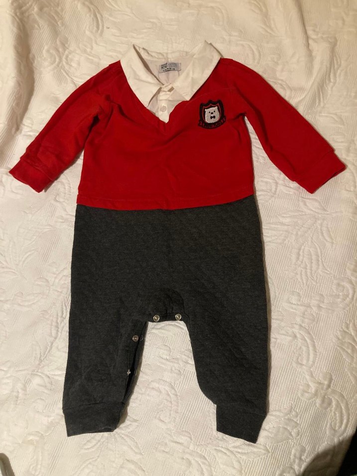 Uzun kollu, yakalı ve düğmeli bebek tulumu, yumuşak ve sıcak kumaştan,1 kere giyilmiştir .