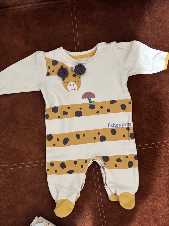Düğmeli, uzun kollu, bisiklet yaka bebek tulumu. Renkli zürafa desenli, yumuşak kumaştan üretilmiştir.