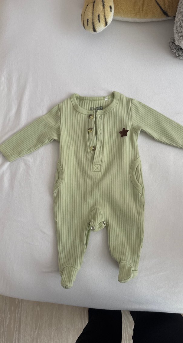 Uzun kollu, düğmeli bebek tulumu, yumuşak ve sıcak kumaştan yapılmıştır. Pastel yeşil renkte, yuvarlak yaka ve küçük yıldız detayına sahiptir. Çok az kullanıldı. sorunsuz.