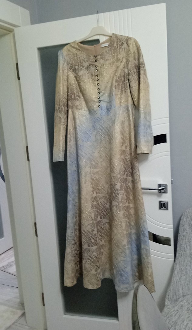 Düğmeli ön kısmı, uzun kollu, bej renkli vintage batik desenli uzun elbisedir. Tekne yaka ve klasik kesimle düğünler için uygundur.