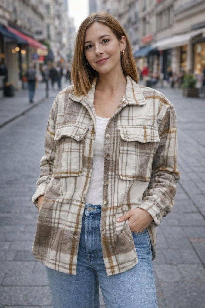 Düğmeli, uzun kollu bej gömlek, yakası kesik ve ekose desenli. Rahat kesimi ve yumuşak, sıcak kumaşıyla günlük kullanıma uygundur.