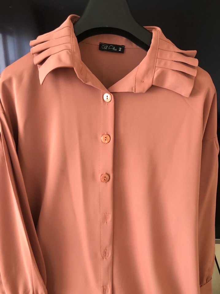 Düğmeli, pilili yakalı, uzun kollu ve bol kesim bej kadın bluz. İpek gibi kumaştan, uzun boyda, minimalist sokak stili için uygun. Marka temsilidir