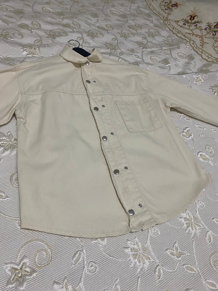 Pamuk kumaştan, düğmeli ve yakalı uzun kollu bol kesim bej kadın gömleği. Günlük rahat kullanım için uygundur.