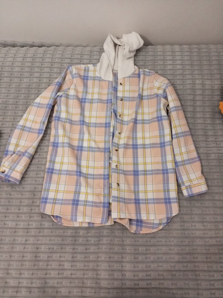 Düğmeli, yakalı, uzun kollu, bol kesim kadın gömleği. Pastel bej kareli desene sahip, yumuşak sentetik kumaştan üretilmiştir. Rahat sokak stili için uygundur.