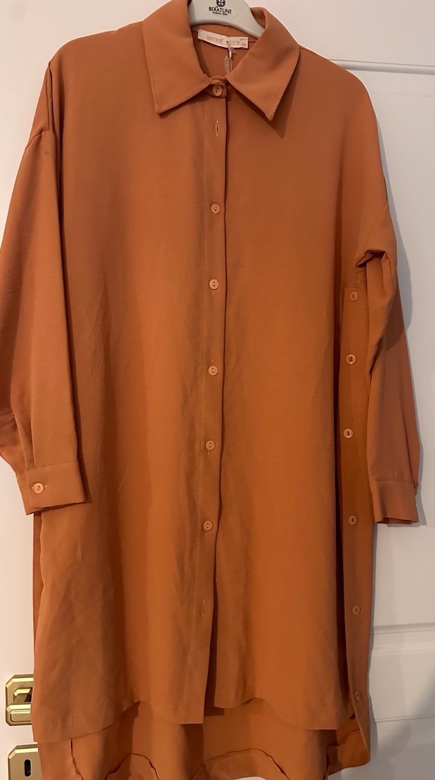 Düğmeli, yakalı ve uzun kollu, bol kesim bej tunik. İpeksi kumaştan, minimalist sokak stili için uygun. Rahat günlük kullanım için ideal.