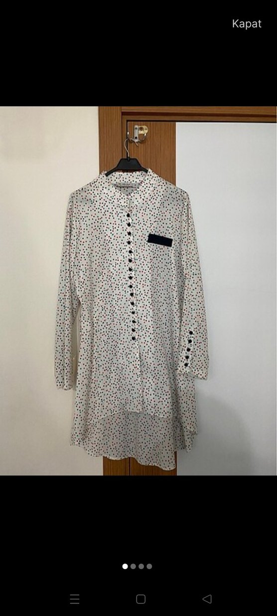 Pamuklu, uzun kollu, düğmeli ve V yakalı beyaz uzun tunik. Desenli, bol kesim, günlük ve sokak modasına uygun.