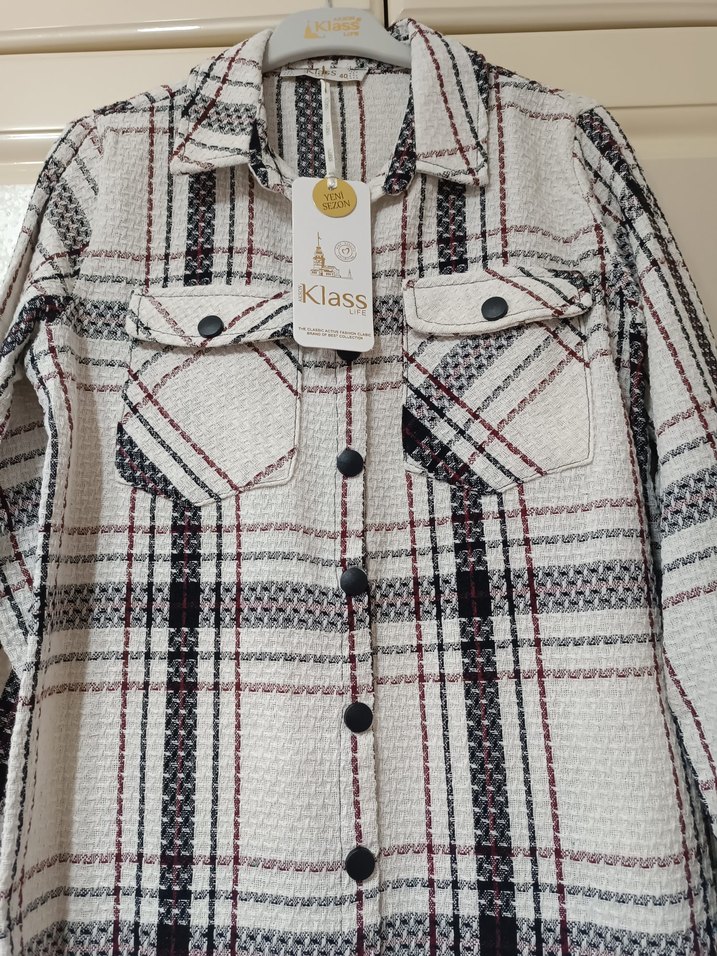 Beyaz tekstil kumaştan, düğmeli ön, uzun kollu ve yakası kesik yakalı gömlek. Regular fit ve ekose desenli, günlük kullanıma uygun trendy casual tarzda.