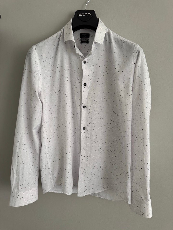 Düğmeli, uzun kollu ve regular fit beyaz gömlek. Gri küçük benek deseniyle ofis ve sokak stiline uygun, sentetik kumaştan üretilmiştir. Hiç kullanılmadı bir kere yıkandı iki koltuk arası 58 cm dir.orjinal tween markadır.