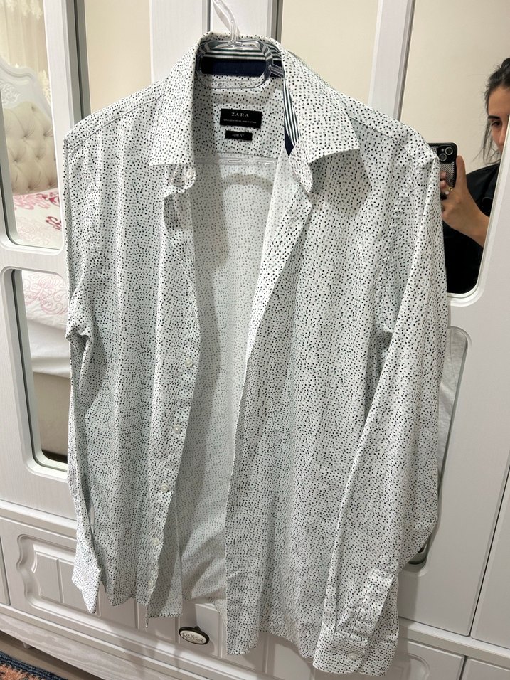 Pamuklu kumaştan yapılmış, düğmeli, uzun kollu ve regular fit beyaz gömlek. İnce gri noktalarla sade bir desen sunar, günlük sokak stili için uygundur.