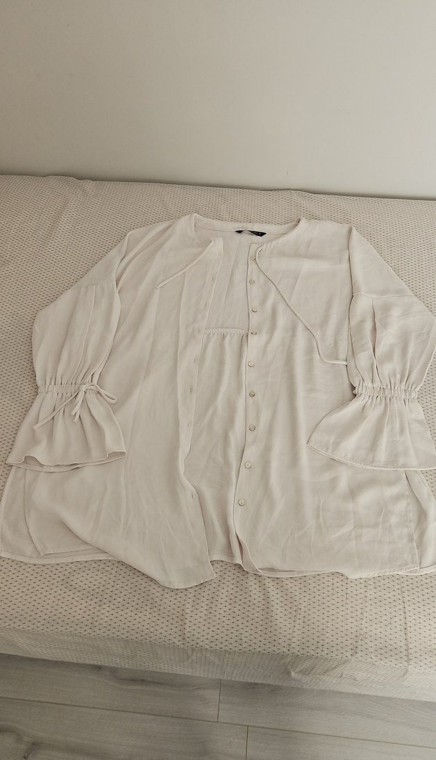Düğmeli, uzun kollu beyaz gömlek. Büzgülü manşetleri ve yuvarlak yakası ile minimalist bohem tarzda, günlük kullanım için uygun. bel kesiğinde ufak bir dikiş atması mevcuttur