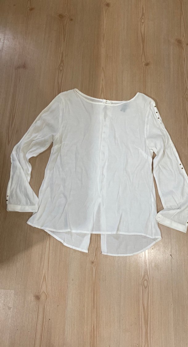 Düğmeli uzun kollu, yuvarlak yaka beyaz keten bluz. Bol kesimi ve bohem tarzı günlük kullanıma uygundur.