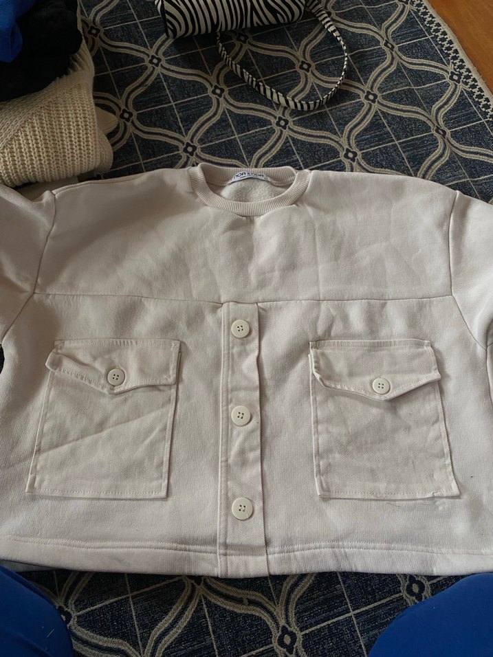 Düğmeli, uzun kollu, yuvarlak yakalı beyaz keten gömlek. Bol kesim ve iki ön cep detayına sahip, rahat sokak stili için uygun.