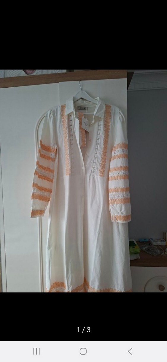 Beyaz renkli, uzun kollu ve nakış detaylı bol kesim uzun elbise. Düğmeli ön ve V yaka tasarımıyla bohem tarzı yansıtıyor. Ürün sıfır etiketlidir,aldım gebelik araya indi kilo aldım ve hiç giyemedim