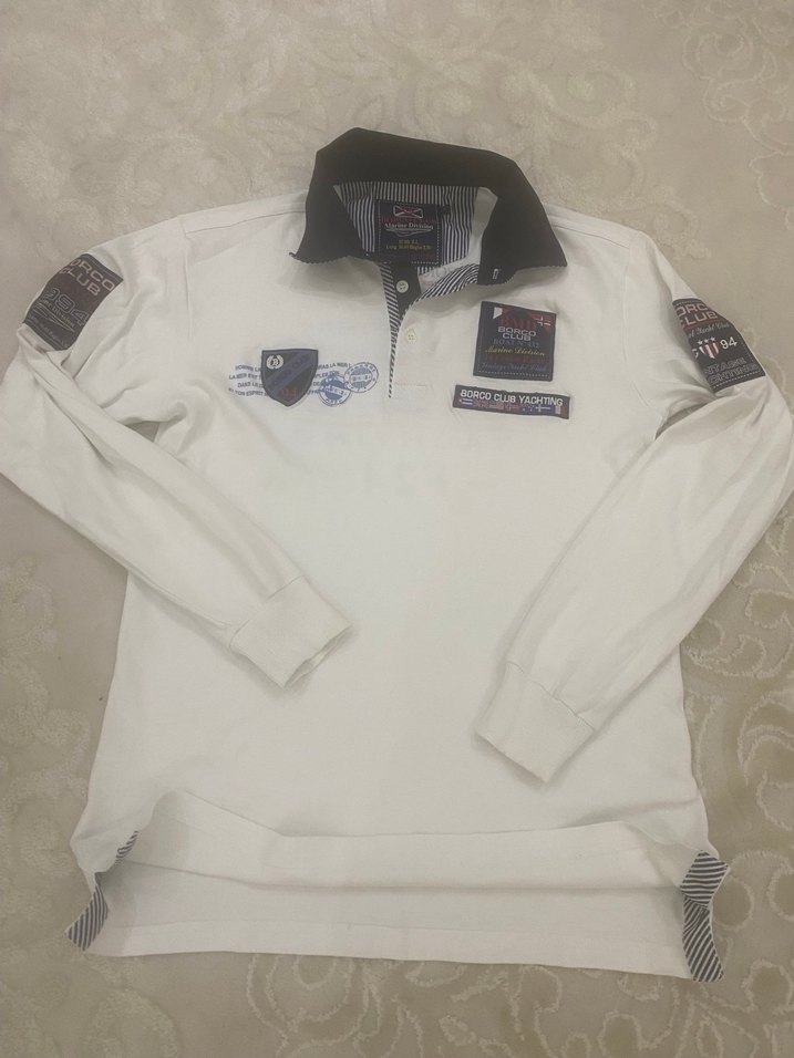 Düğmeli yakalı, siyah yakalı uzun kollu beyaz polo tişört. Baskılı patch detayları ve bol kesimiyle outdoor kullanım için uygun. ️ Marc’a etiketindekidir