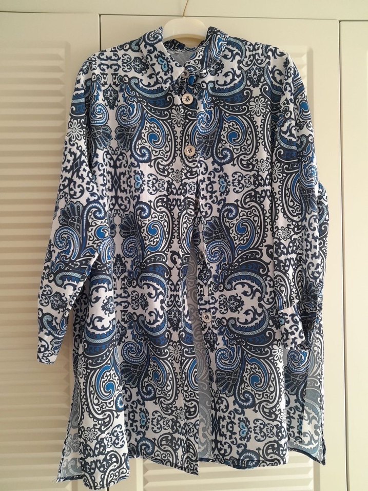 Uzun kollu, düğmeli ve yüksek yakalı bu uzun kesim kadın gömleği, mavi ve gri desenli tekstil kumaştan, bohem tarzda tasarlanmıştır.