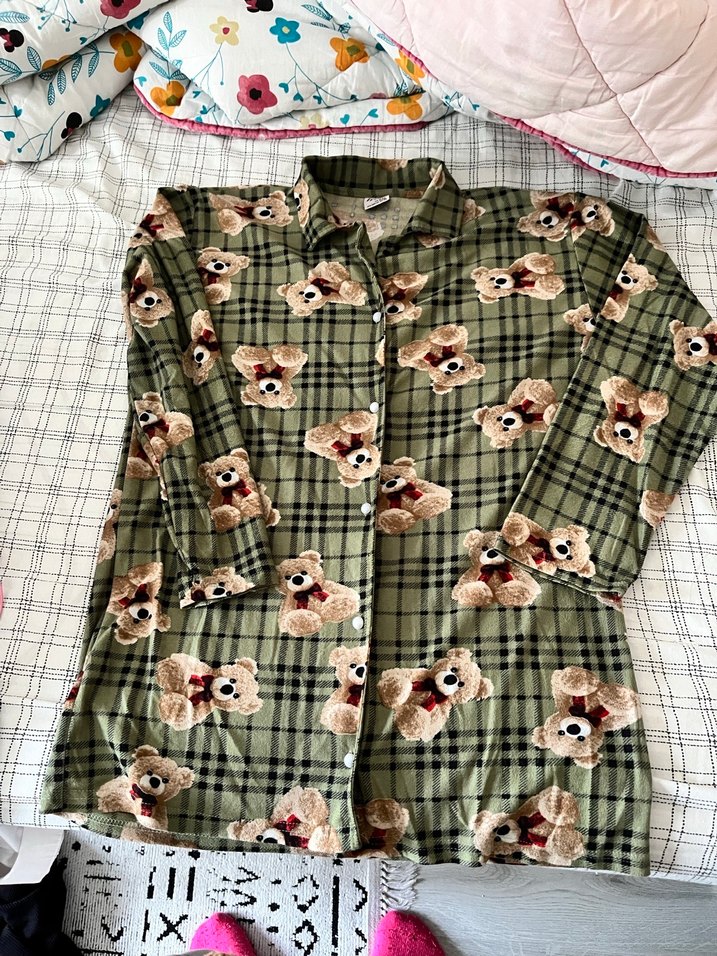 Düğmeli ön cepheli, yakalı, uzun kollu ve bol kesim kadın gömleği. Yumuşak dokulu tekstil kumaştan, pastel kahverengi ekoseli ve ayıcık desenli, günlük kullanıma uygun gecelik