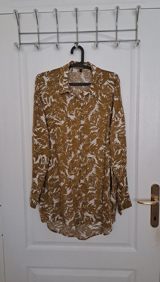 Düğmeli, uzun kollu, yakalı ve bol kesim kahverengi batik desenli kadın gömlek. Yumuşak sentetik kumaştan, gündelik ve bohem tarzlar için uygun.