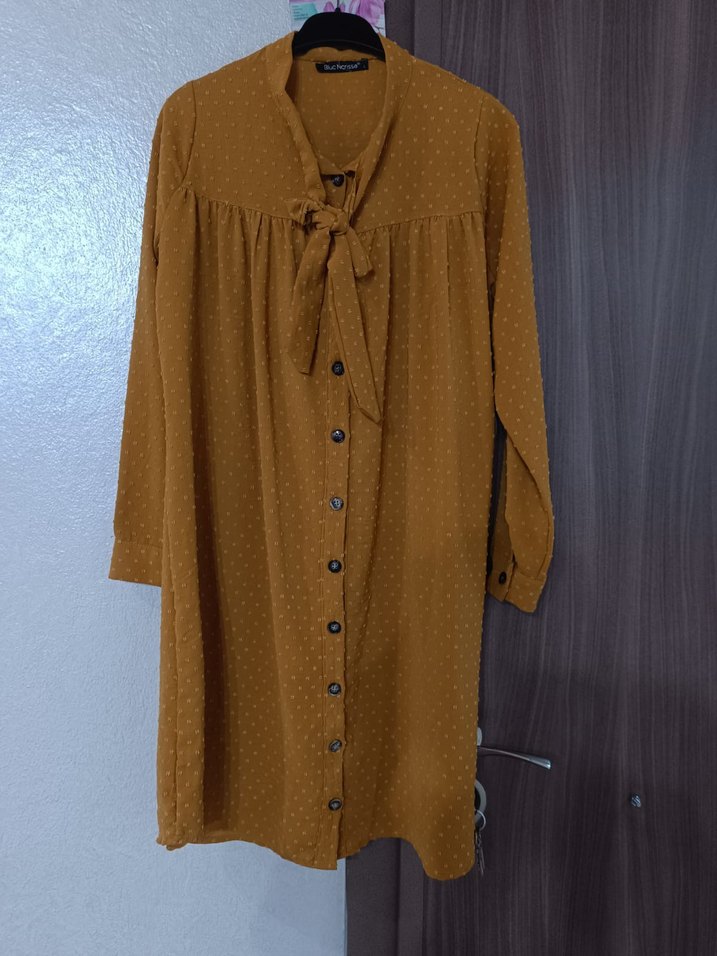 Kahverengi, uzun boylu ve düğmeli ön kısmı ile bol kesim bu tunik, parlak sentetik kumaştan yapılmıştır. Günlük kullanım için bohem tarzını yansıtır.