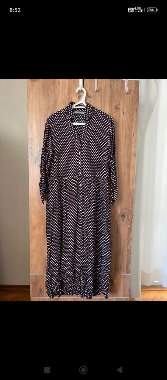Düğmeli, uzun kollu ve yakalı, bol kesim uzun elbise. Yumuşak sentetik kumaştan, koyu kahverengi ve bağlama desenli.