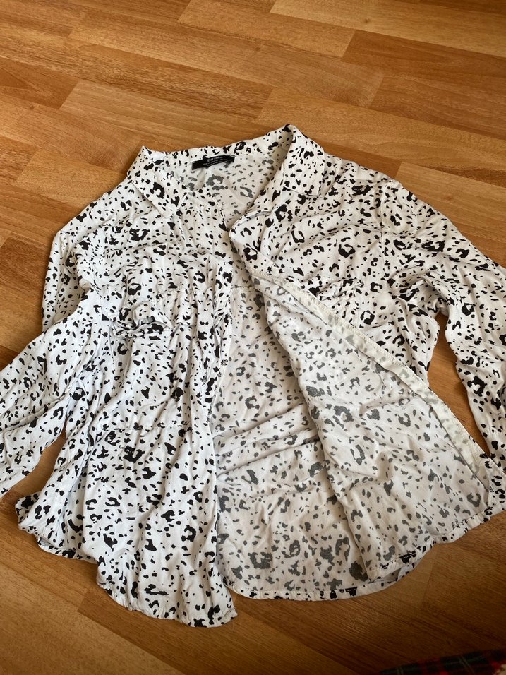 Uzun kollu, düğmeli, bol kesim kadın gömlek. Siyah beyaz baskılı desene sahip, sentetik yumuşak kumaştan yapılmıştır. Günlük kullanım için uygundur.