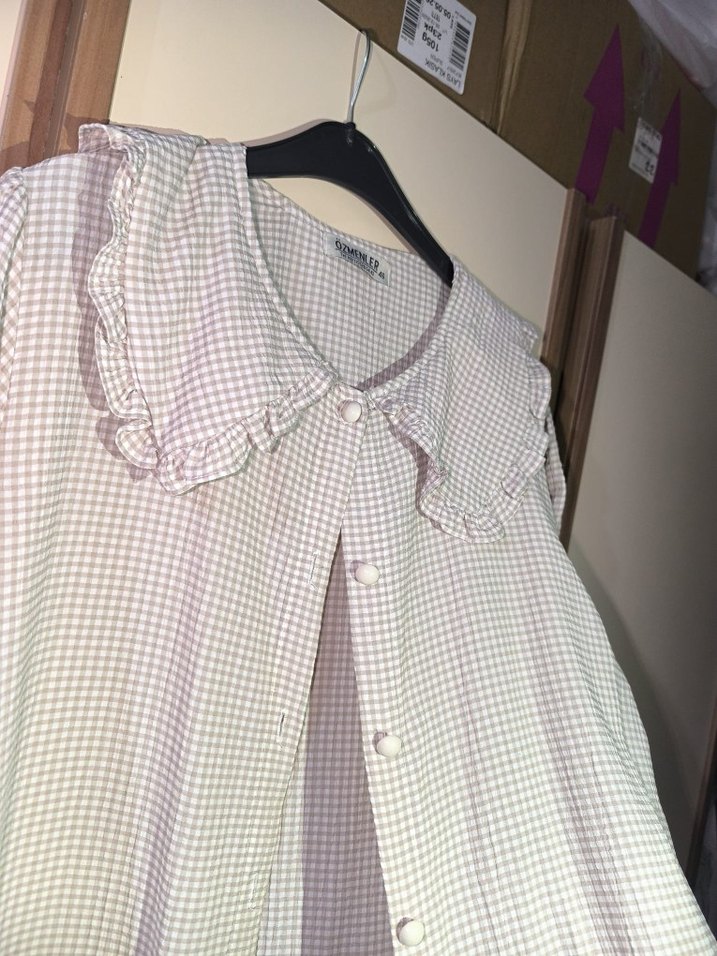 Yumuşak keten kumaştan, uzun kollu, düğmeli ve bol kesim kadın gömlek. Geniş yakalı ve pastel kareli desende, günlük kullanım için uygundur.