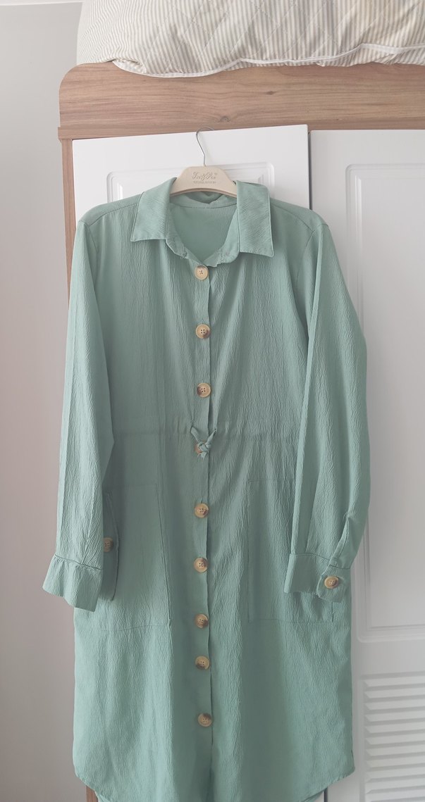 Düğmeli önü, uzun kollu ve yakalı bu pastel yeşil bluz, yumuşak kumaştan üretilmiştir. Rahatlık için bol kesim ve uzun boydadır. Minimalist ve bohem tarzda, günlük şıklık sunar. su yeşili rengi