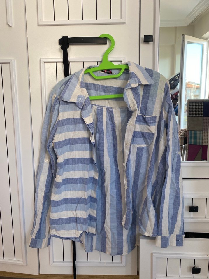 Düğmeli, uzun kollu, yakalı gömlek. Mavi ve beyaz çizgili, bol kesim, rahat günlük sokak stili için uygundur dar kalıp .