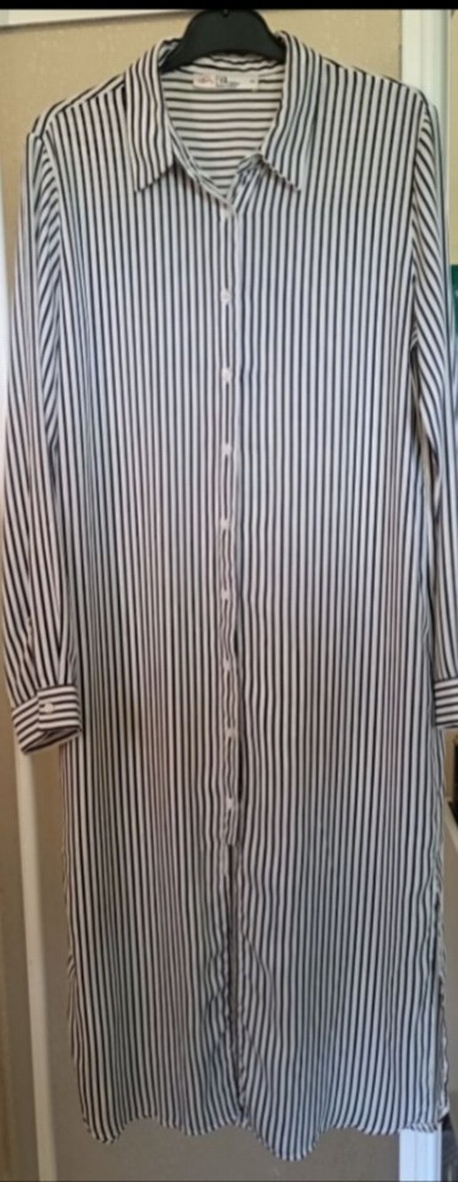 Uzun kollu, düğmeli ve çizgili desenli uzun kesim kadın gömleği.