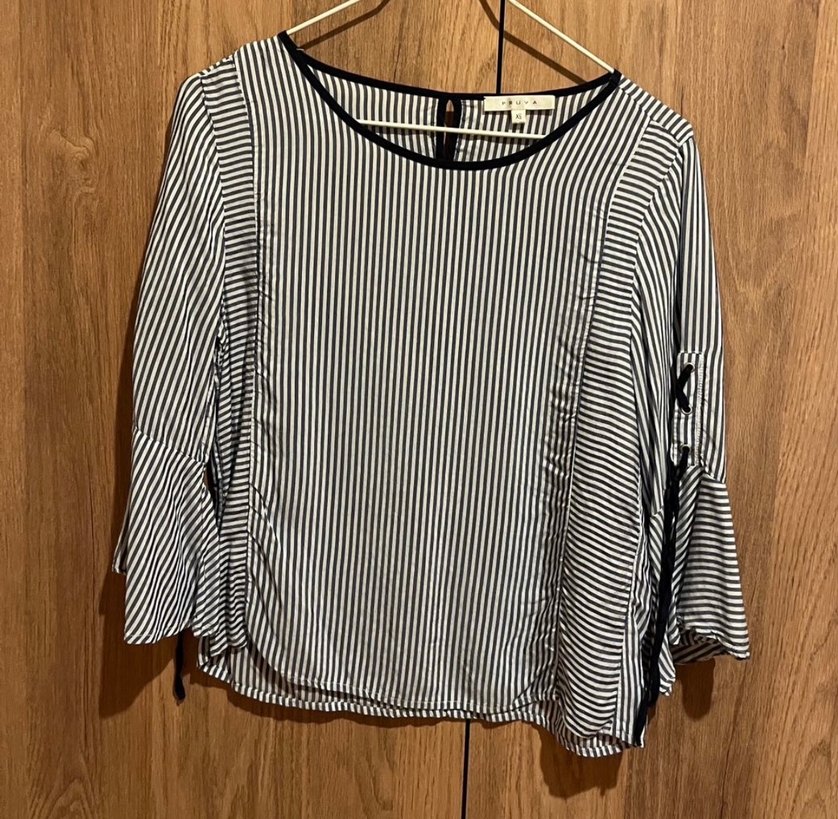 Uzun kollu, yuvarlak yakalı, düğmeli detaylı, sentetik kumaştan yapılmış, bol kesim çizgili kadın bluz. Rahat sokak stili için uygundur.