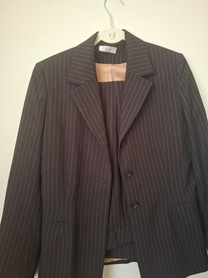 Düğmeli ön kısmı ve kesikli yakasıyla kadın ceket. İpek gibi dokulu, gri çizgili kumaştan, klasik ve şık ofis tarzı için ideal.pantolon takım