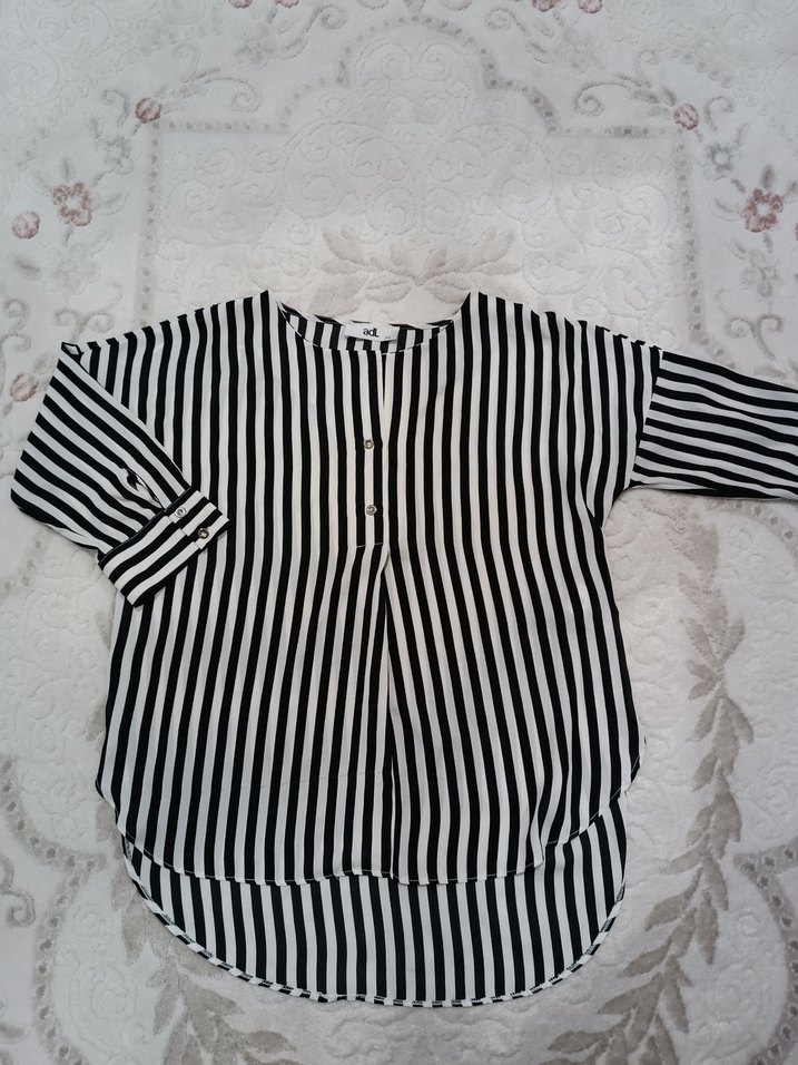 Düğmeli ön kısmı ve kayık yaka detaylı, uzun kollu, pamuklu kumaştan yapılmış siyah beyaz çizgili bol kesim gömlek.