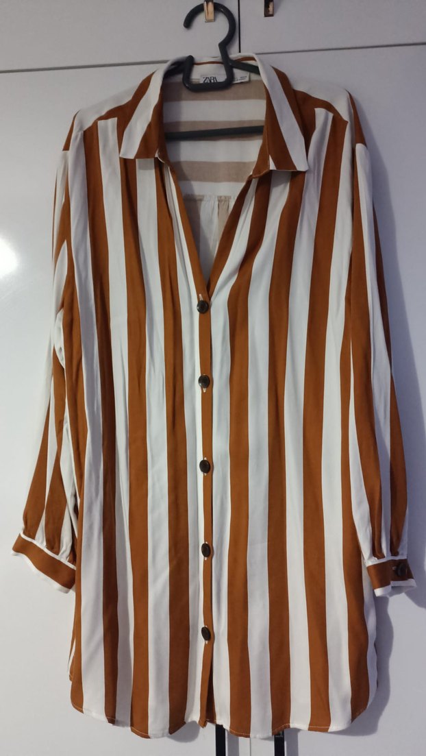 Düğmeli, uzun kollu, bol kesim kadın gömleği. Bej ve kahverengi çizgili, sentetik kumaştan, günlük sokak stiline uygun.