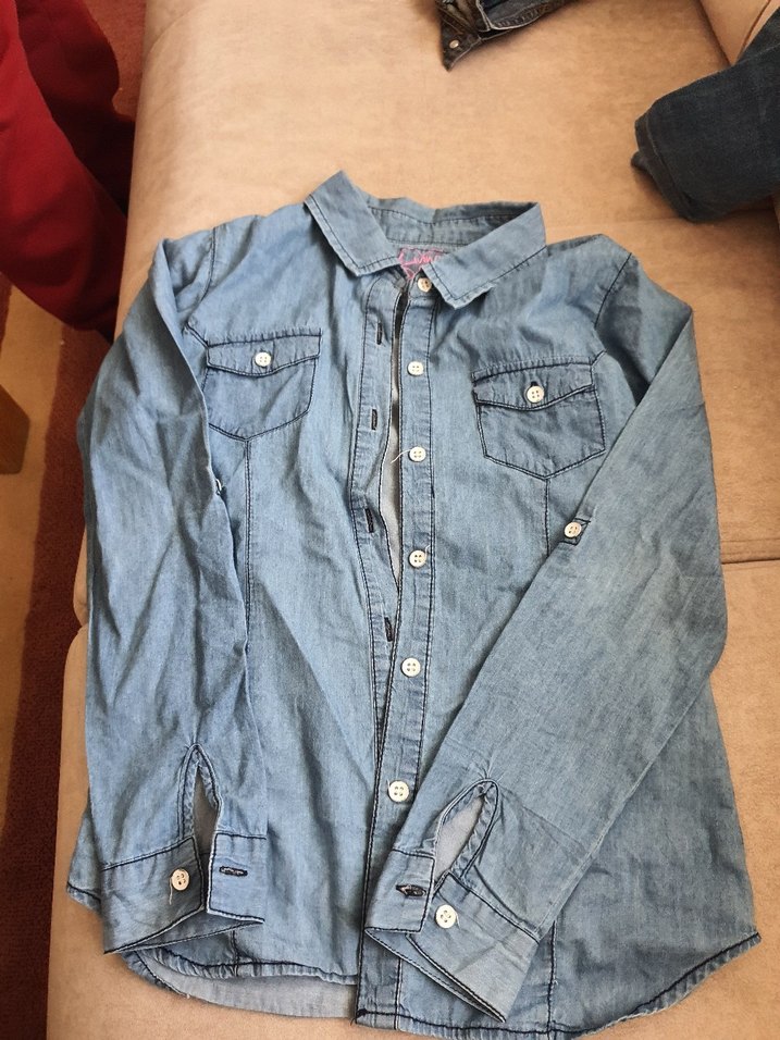 Düğmeli ön, uzun kollu ve kesik yakalı, fitted kesim denim gömlek. Mavi renkte, desen içermeyen, günlük kullanım için uygun midi uzunlukta rahat bir tarz sunar numarası yazıyor ben 7 yaşında giydirmiştim