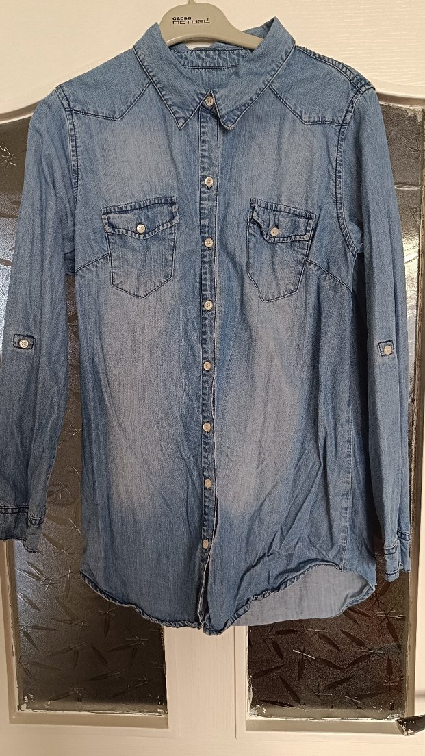 Mavi-gri denim gömlek, yakalı, düğmeli ön ve iki göğüs cebine sahiptir. Salaş kesim, uzun kollu ve normal midi boydadır, gündelik sokak stiline uygundur.