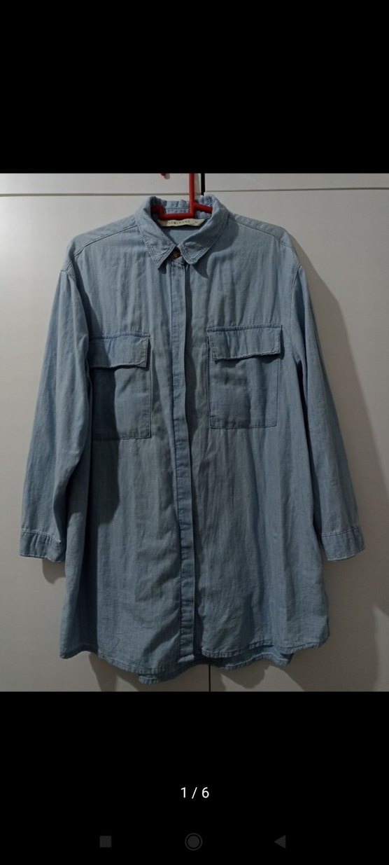Düğmeli ön kısmı ve yakalı uzun kollu, bol kesim denim kadın gömleği. Midi boy ve sade mavi renkte, günlük rahat sokak stili için uygun.