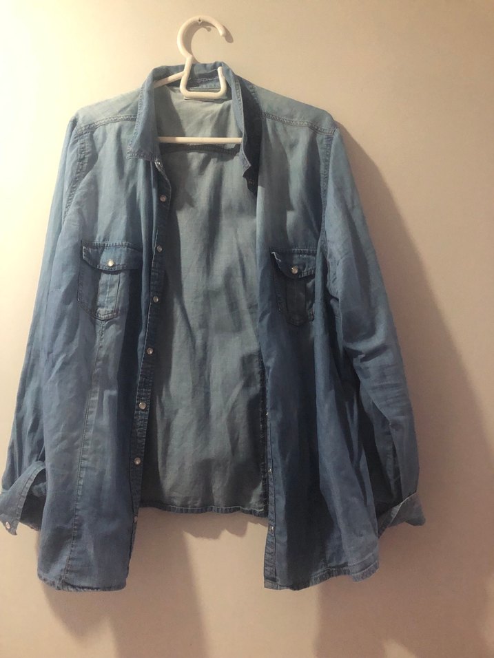 Bu bol kesim denim gömlek, uzun kollu ve düğmeli olup, çentikli yaka ile günlük kullanım için uygun gri-mavi renktedir.