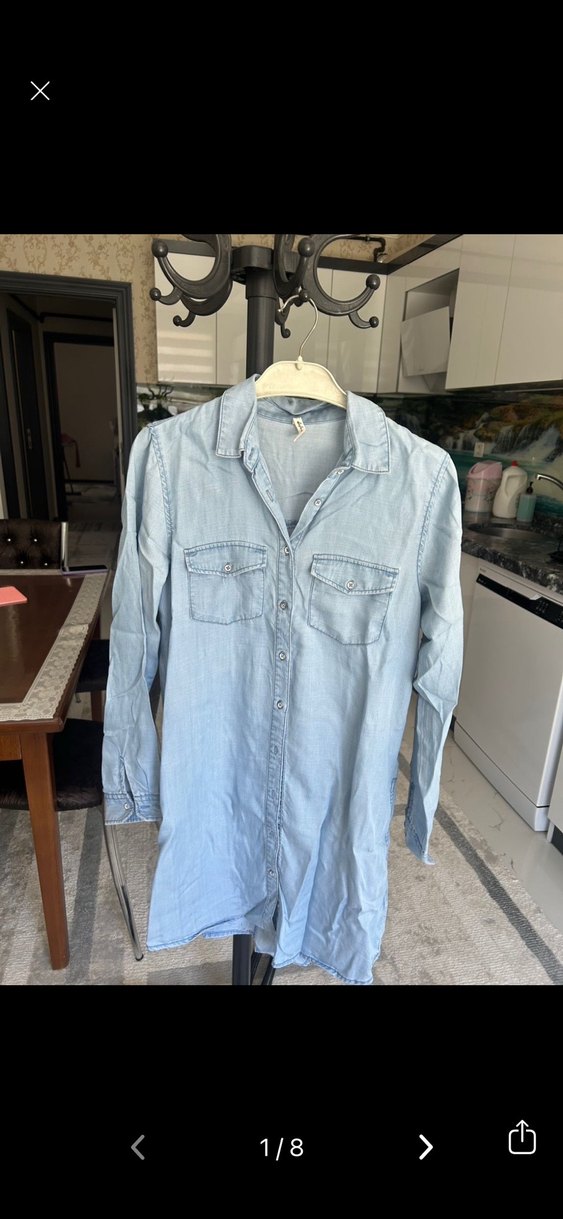 Düğmeli, yakalı ve uzun kollu, bol kesim mavi denim kadın gömleği. Normal midi boyda, günlük rahat sokak stiline uygun.