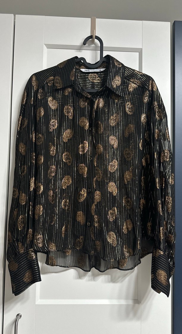 Düğmeli, uzun kollu, yakalı ve bol kesim kadın gömlek. Koyu renkli, altın detaylı desenli kumaştan, vintage bohem tarzında, ofis için uygun.