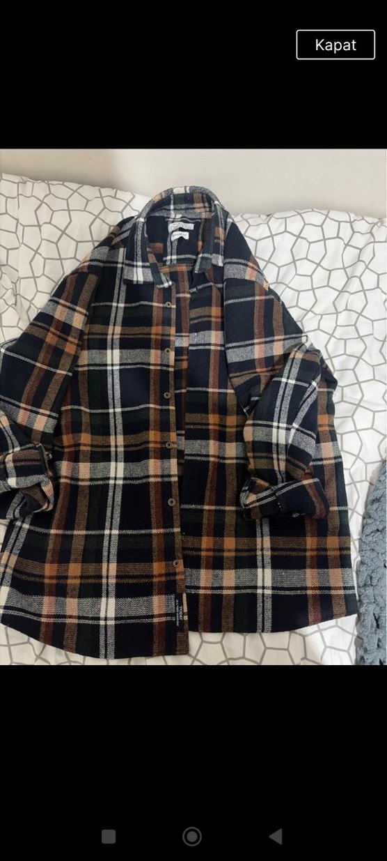 Düğmeli, yakalı ve uzun kollu bu rahat kesim gömlek, koyu kahverengi ekose desenlidir. Normal midi boyda, yumuşak dokulu kumaştan üretilmiştir. L beden sıcak tutar