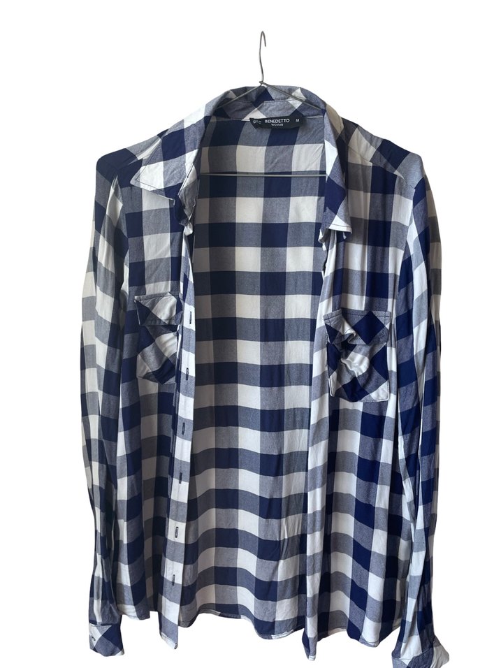 Pamuk kumaştan, düğmeli ve yakalı uzun kollu kadın gömleği. Bol kesim, mavi ve gri ekose desenli, rahat sokak stili için uygun.