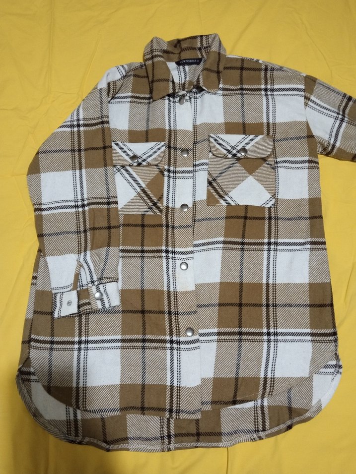 Düğmeli, uzun kollu, kahverengi ve gri tonlarda ekose desenli, cepli, rahat kesim kadın gömleği. Günlük sokak stiline uygundur.