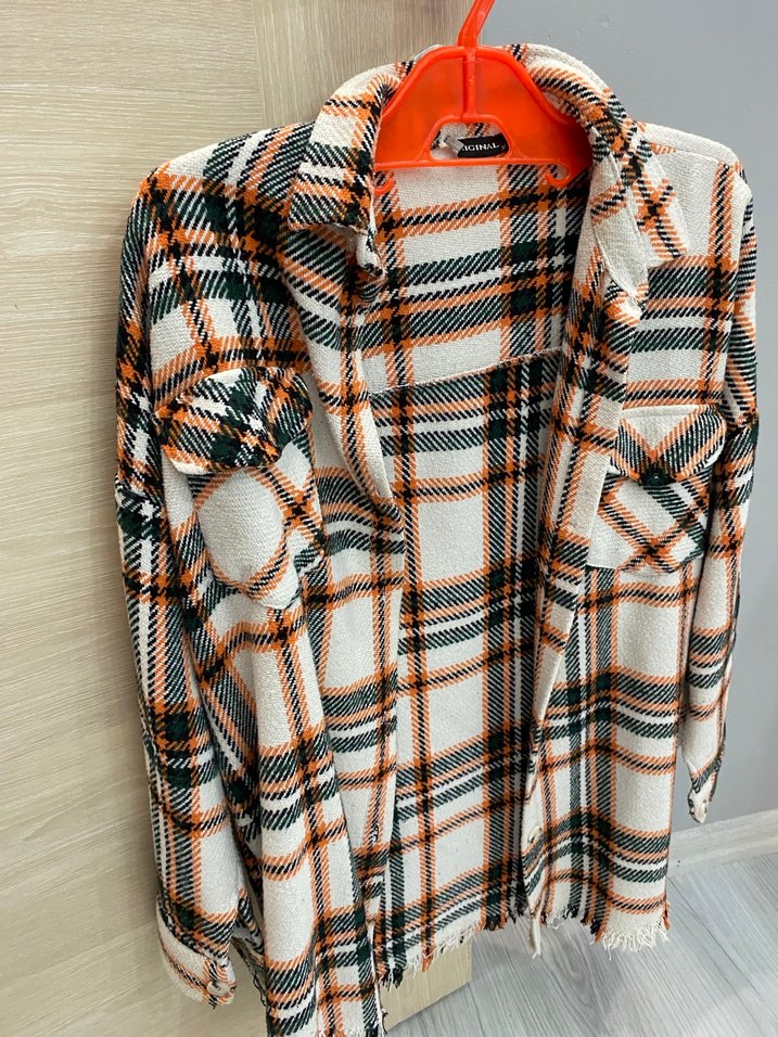 Düğmeli ön kısmı ve çentikli yakası olan uzun kollu kadın gömleği. Gri ve çok renkli ekose desenli, bol kesim ve tekstil kumaştan üretilmiştir. Günlük sokak tarzı için uygundur. Oduncu gömleği yeni gibi