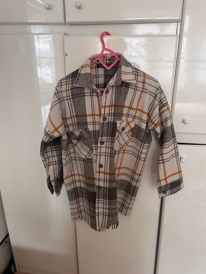 Yumuşak yün kumaştan yapılmış, düğmeli, uzun kollu, bol kesim kadın gömleği. Kahverengi ve gri ekose deseniyle günlük sokak stiline uygundur. #ekose #gömlek #hırka #oduncu #düğme m beden ama bol olduğu için l de olur