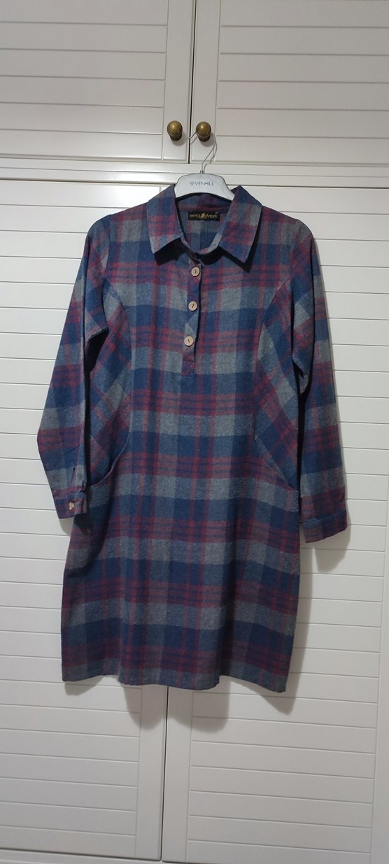 Yün kumaştan yapılmış, düğmeli, uzun kollu ve notalı yaka detaylı, ekose desenli, gri ve mor tonlarında, midi boy ve bol kesim kadın gömleği. Rahat ve gündelik kullanım için uygundur.