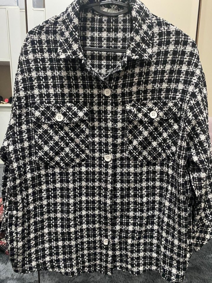 siyah beyaz ekose desenli kadın gömlek, uzun kollu ve düğmeli ön yapıya sahiptir. Notlu yaka, regular fit ve midi boyda,günlük kullanıma uygundur. kışlıktır ceket yada gömlek olarak kullanılabilir